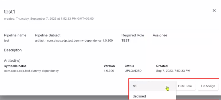 Let us imagine a bundle pipeline triggered by the event Artifact Created. To this event a user task is added named test1, with possible results “ok” or “declined”. By an “ok” result, we want to execute further, adding another user task, which we will simply call here “ok pressed”.