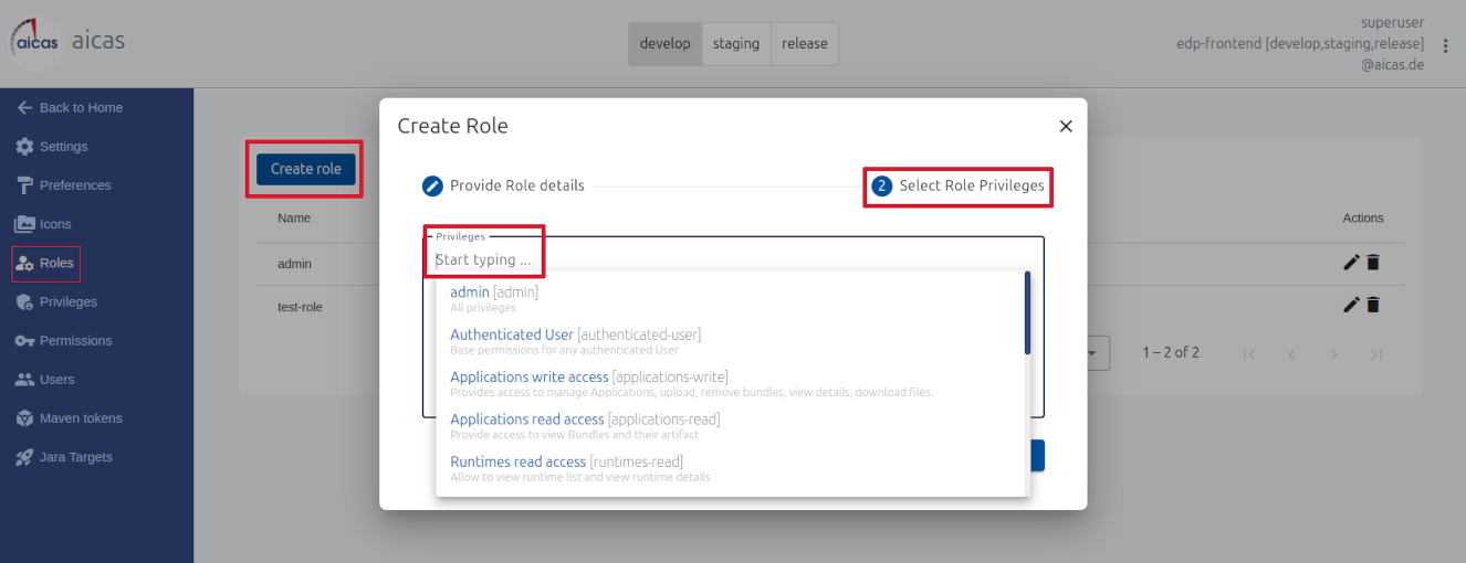 Similar to creating roles, the process of creating privileges also includes, after entering an unique name and description, selecting from a list of the available permissions both in the front- and in the backend.