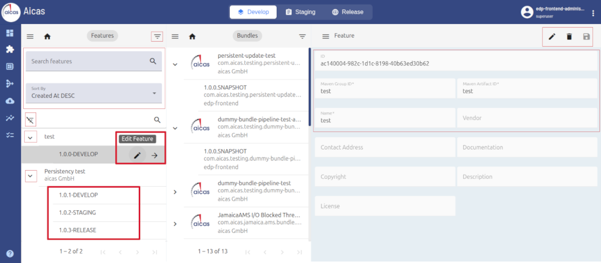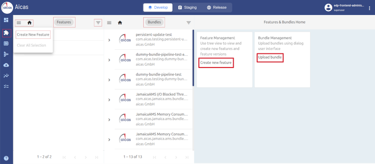 Once in the Features & Bundles area, for each selected environment, authorized users can upload bundles, create new features and versions and group them within other features.