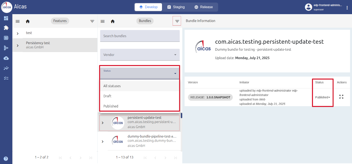 While users can manually change a software component’s status, automatic adjustments can be triggered out of bundle pipelines. There, status determines which action nodes are allowed: for example, the status “published” is a prerequisite for a component to be promoted, i.e. transition from develop to the environments staging or release. Similarly, in general artifacts can only be deployed into a runtime after being published. An exception is made for the environment develop, where drafts are also deployable.