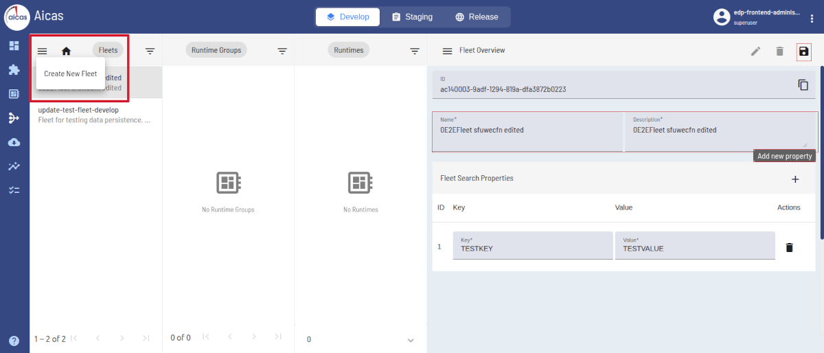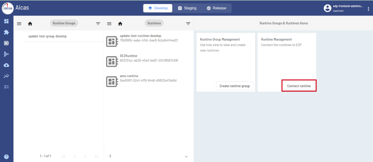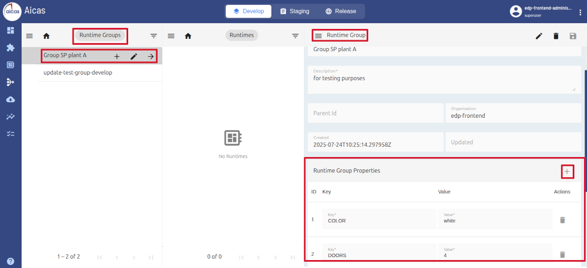 In Runtimes, the entry view on the left lists the available runtime groups. Once a group is selected, all its components (single runtimes or other runtime groups) are listed. At this point, users can edit the groups’s description, and define properties.
