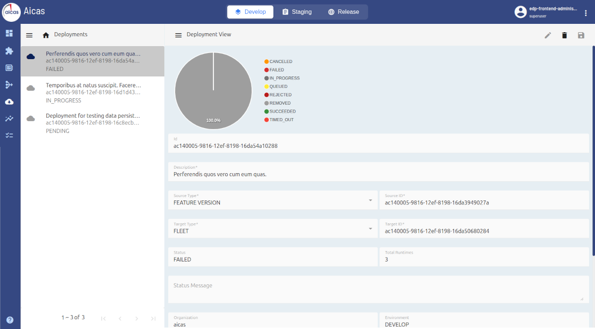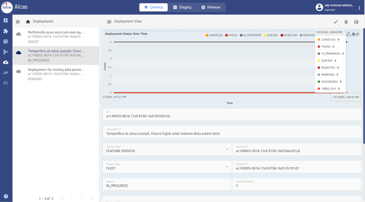 The hamburger menu (three bars menu) in the deployment view offers action options that depend on the status. While a deployment is still “pending”, users can opt to deploy it. Once started, the deployment’s status changes into “in_progress”. Users can then cancel it and define a time interval to auto refresh the view. This menu also offers to clear history or close the development view window.