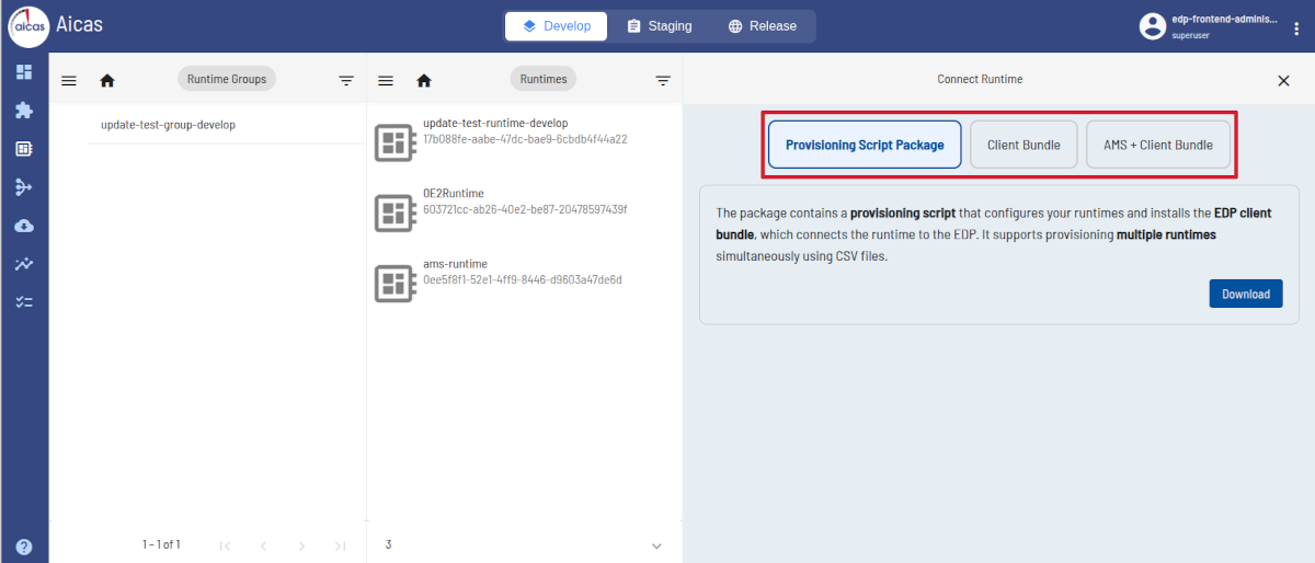 The provisioning script configures the runtimes, by installing in them the client bundle, which is needed to establish the connection to EDP. By adapting the csv file provided in the downloaded zip package, it is possible to provision multiple runtimes at once.