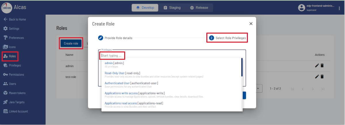 EDP displays the list of current defined roles, and new roles can be added by users with the appropriate rights to do so. Adding new roles, or modifying existing ones, also means assigning (or removing) privileges. Simply start typing and the available privileges will be offered, then select from the privileges that are listed.